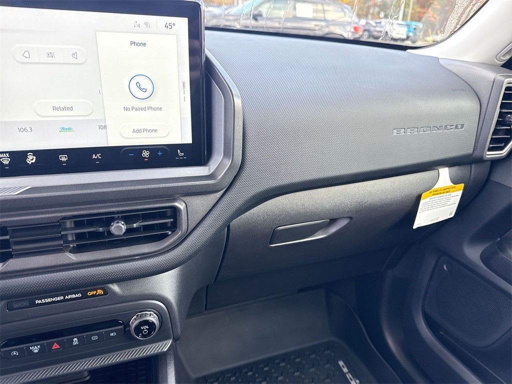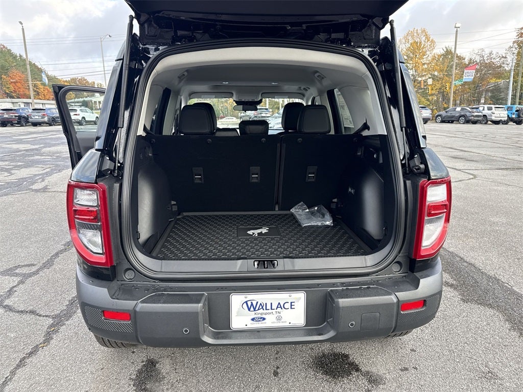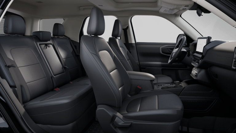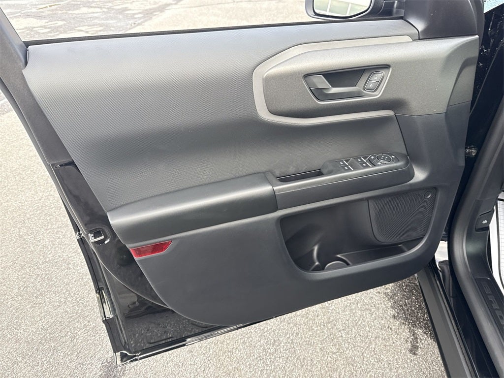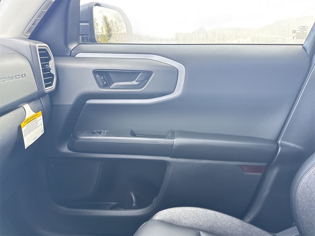 Black Appearance Package (Carbon Black Grille w/Black BRONCO Lettering, Cargo Mat, Front & Rear Floor Liners w/o Carpet Mats, Front Driver/Passenger Seat Back Map Pockets, Liftgate w/Black BRONCO SPORT Lettering, Painted Shadow Black Roof, Premium Trimmed Htd Fr Sport Contour Bucket Seats, and Wheels: 17 Matte Black-Painted Aluminum), Convenience Package (Heated 8-Way Power Driver's Seat, LED Fog Lamps, Premium Wrapped Steering Wheel, and Universal Garage Door Opener (UGDO)), Equipment Group 200A, 4-Wheel Disc Brakes, 6 Speakers, ABS brakes, Air Conditioning, Alloy wheels, AM/FM radio: SiriusXM, AM/FM Stereo, Auto High-beam Headlights, Automatic temperature control, Brake assist, Cloth w/Easy-to-Clean Front Bucket Seats, Compass, Delay-off headlights, Driver door bin, Driver vanity mirror, Dual front impact airbags, Dual front side impact airbags, Electronic Stability Control, Emergency communication system: SYNC 4 911 Assist, Four wheel independent suspension, Front anti-roll bar, Front Bucket Seats, Front Center Armrest, Front License Plate Bracket, Front reading lights, Fully automatic headlights, Heated door mirrors, Illuminated entry, Knee airbag, Low tire pressure warning, Occupant sensing airbag, Outside temperature display, Overhead airbag, Overhead console, Panic alarm, Passenger door bin, Passenger vanity mirror, Power door mirrors, Power Moonroof, Power steering, Power windows, Radio data system, Rear anti-roll bar, Rear Parking Sensors, Rear reading lights, Rear seat center armrest, Rear window defroster, Rear window wiper, Remote keyless entry, Security system, SiriusXM, Speed control, Speed-sensing steering, Speed-Sensitive Wipers, Split folding rear seat, Steering wheel mounted audio controls, SYNC 4 w/Enhanced Voice Recognition, Tachometer, Telescoping steering wheel, Tilt steering wheel, Traction control, Trip computer, Variably intermittent wipers, and Wheels: 17 Carbonized Gray-Painted AluminuM.