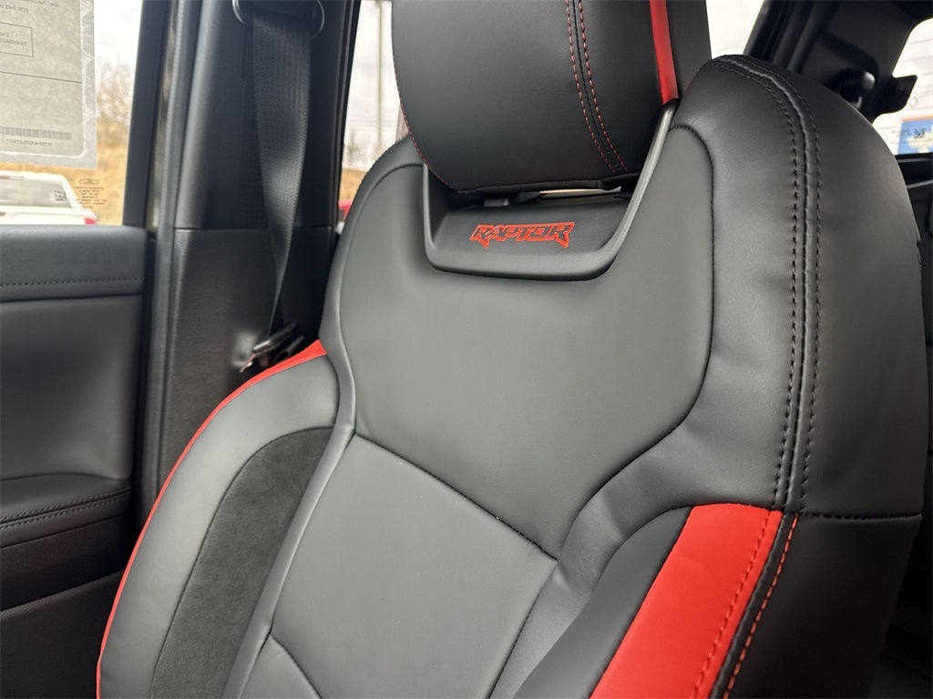 4WD, 10 Speakers, 4-Wheel Disc Brakes, 4.27 Axle Ratio, ABS brakes, Air Conditioning, Alloy wheels, AM/FM radio: SiriusXM, Auto High-beam Headlights, Auto-dimming Rear-View mirror, Automatic temperature control, Brake assist, Compass, Delay-off headlights, Driver door bin, Driver vanity mirror, Dual front impact airbags, Dual front side impact airbags, Electronic Stability Control, Emergency communication system: SYNC 4 911 Assist, Front anti-roll bar, Front Bucket Seats, Front Center Armrest, Front dual zone A/C, Front fog lights, Front reading lights, Front wheel independent suspension, Fully automatic headlights, Garage door transmitter, Heated door mirrors, Heated front seats, Heated steering wheel, Illuminated entry, Internet access capable: FordPass Connect 4G, Leather Shift Knob, Leather steering wheel, Leather-Trimmed Front Heated Bucket Seats, Low tire pressure warning, Memory seat, Navigation system: Connected Navigation, Occupant sensing airbag, Outside temperature display, Overhead airbag, Overhead console, Panic alarm, Passenger door bin, Passenger vanity mirror, Power door mirrors, Power driver seat, Power passenger seat, Power steering, Power windows, Radio: B&O Sound System by Bang & Olufsen, Rain sensing wipers, Raptor Exterior Graphics, Rear reading lights, Rear seat center armrest, Rear step bumper, Rear window defroster, Remote keyless entry, Security system, SiriusXM Satellite Radio, Speed control, Speed-sensing steering, Steering wheel mounted audio controls, SYNC 4A, Telescoping steering wheel, Tilt steering wheel, Traction control, Trip computer, Turn signal indicator mirrors, Variably intermittent wipers, Voltmeter, and Wheels: 17 Gray-Painted AluminuM.
