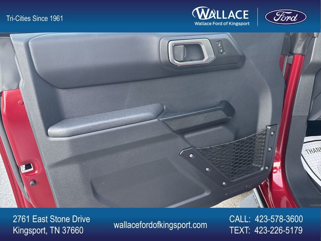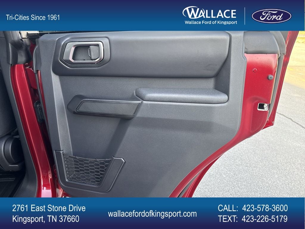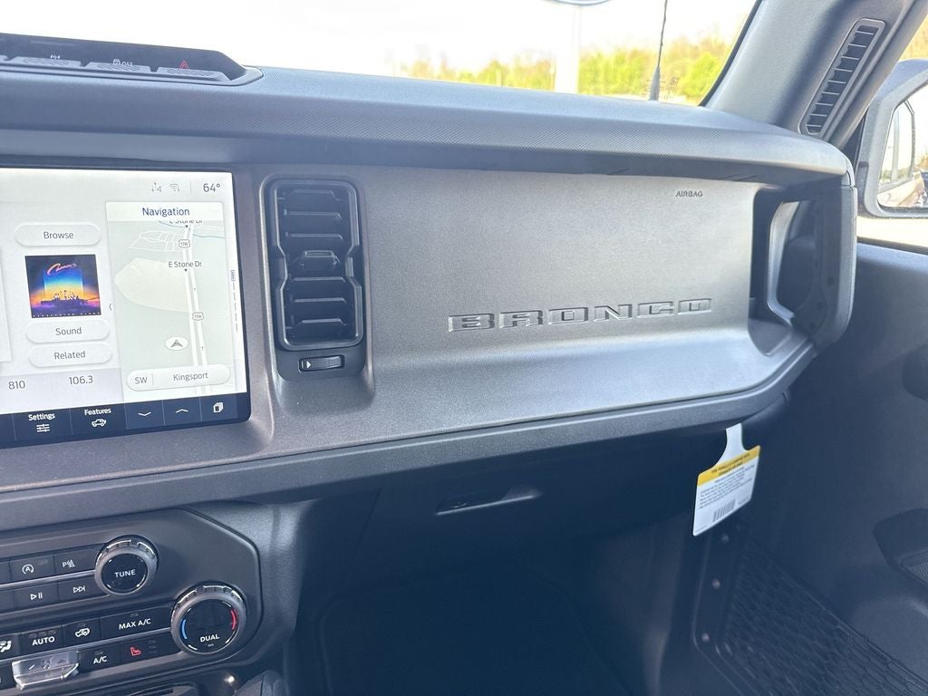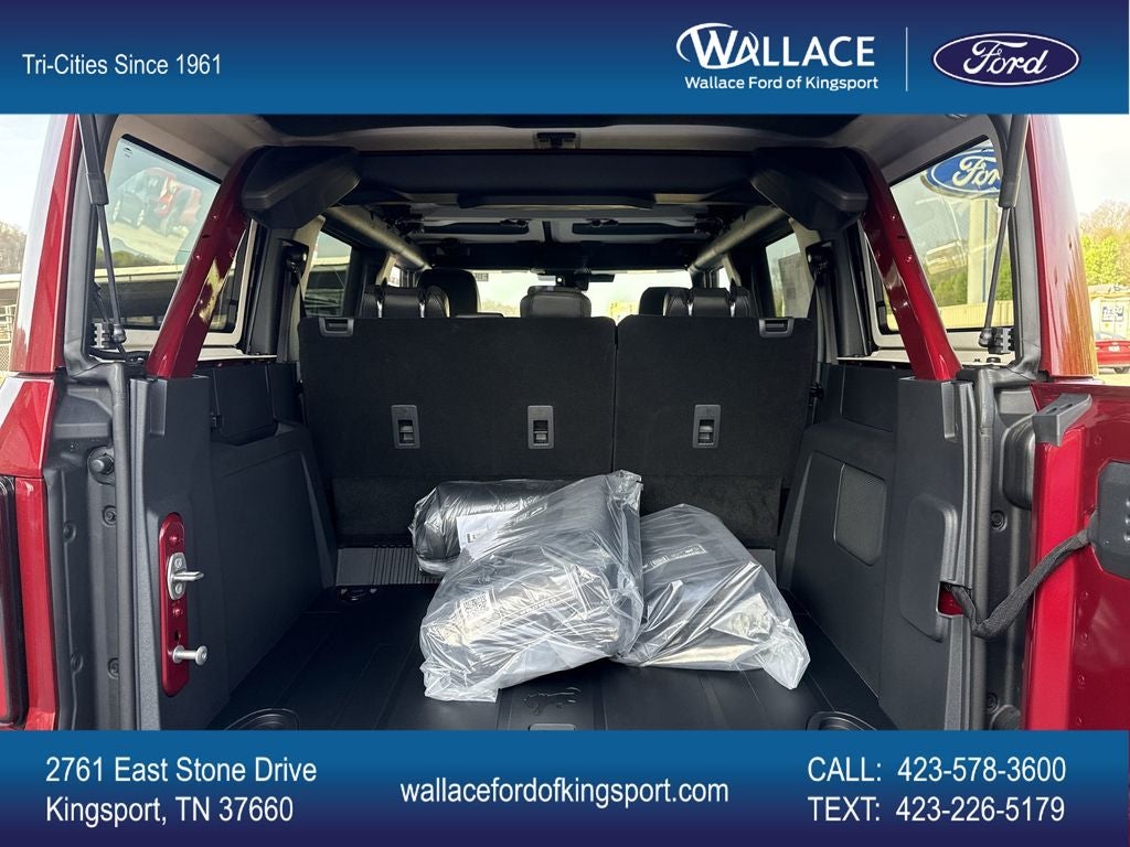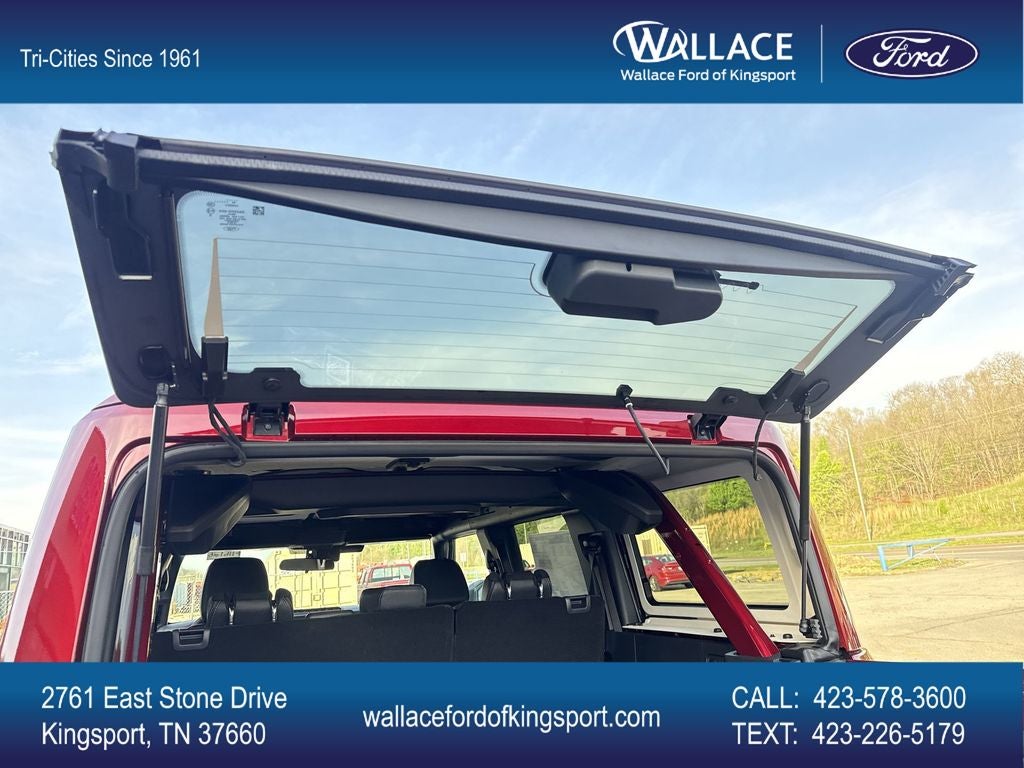 Equipment Group 334A Lux Package (2-Door Intelligent Access with Lock/Unlock, 360-Degree Camera, Adaptive Cruise Control, Ambient Footwell Lighting, Connected Navigation, Driver and Front Passenger Illuminated Sliding Visor Vanity Mirrors, Dual Smart Charging USB Ports, Dual-Zone Electronic Automatic Temperature Control, Evasive Steering Assist, Front Parking Sensors, Front Row Heated Seats, Heated Steering Wheel, Information on Demand Panel, Marine Grade Vinyl Heated Bucket Seats, Pro Power Onboard - 400W, Rear Parking Sensors, Sideview Mirrors, and Wheels: 17 Carbonized Gray-Painted Aluminum), Ford Connectivity Package (1-Year Included), Sasquatch Package (Front Stabilizer Disconnect, High Clearance Suspension, and Position-Sensitive Bilstein Shock Absorbers), 4-Wheel Disc Brakes, 7 Speakers, ABS brakes, Air Conditioning, Alloy wheels, AM/FM radio: SiriusXM with 360L, AM/FM Stereo, Auto High-Beam Headlamps, Auto High-beam Headlights, Auto-dimming Rear-View mirror, BLIS Blind Spot Information System, Brake assist, Compass, Delay-off headlights, Driver door bin, Driver vanity mirror, Dual front impact airbags, Dual front side impact airbags, Electronic Stability Control, Emergency communication system: 911 Assist, Exterior Parking Camera Rear, Front anti-roll bar, Front Bucket Seats, Front Center Armrest, Front fog lights, Front reading lights, Front Row Top Panels and Door Storage Bags, Front wheel independent suspension, Fully automatic headlights, Hard Top Sound Deadening Headliner, Heated door mirrors, Heated front seats, Illuminated entry, Integrated roll-over protection, Lane-Keeping System, Leather Shift Knob, Low tire pressure warning, Occupant sensing airbag, Outside temperature display, Overhead airbag, Overhead console, Painted Hard Top, Panic alarm, Passenger door bin, Passenger vanity mirror, Power door mirrors, Power steering, Power windows, Pre-Collision Assist with Automatic Emergency Braking, Radio data system, Raptor-Style Running Board, Rear-View Camera, Rear-Window Defroster and Washer, Remote keyless entry, Security system, SiriusXM with 360L, Speed control, Split folding rear seat, Steering wheel mounted audio controls, SYNC 4, Tachometer, Telescoping steering wheel, Tilt steering wheel, Traction control, Trip computer, Variably intermittent wipers, and VoltmeteR.