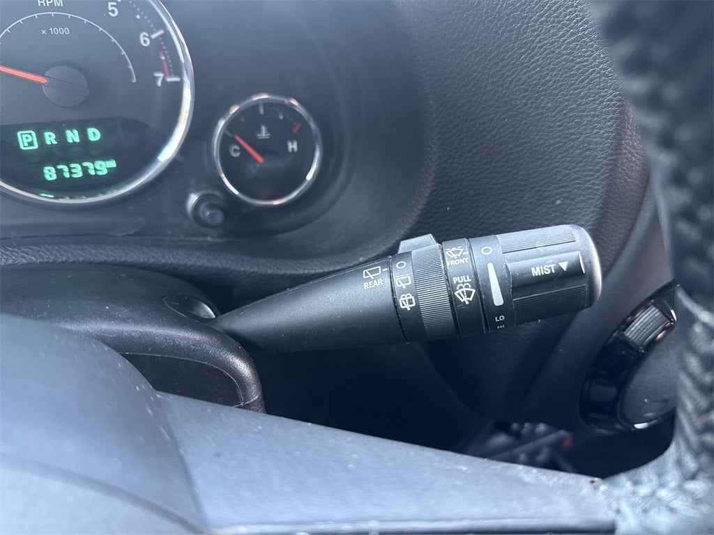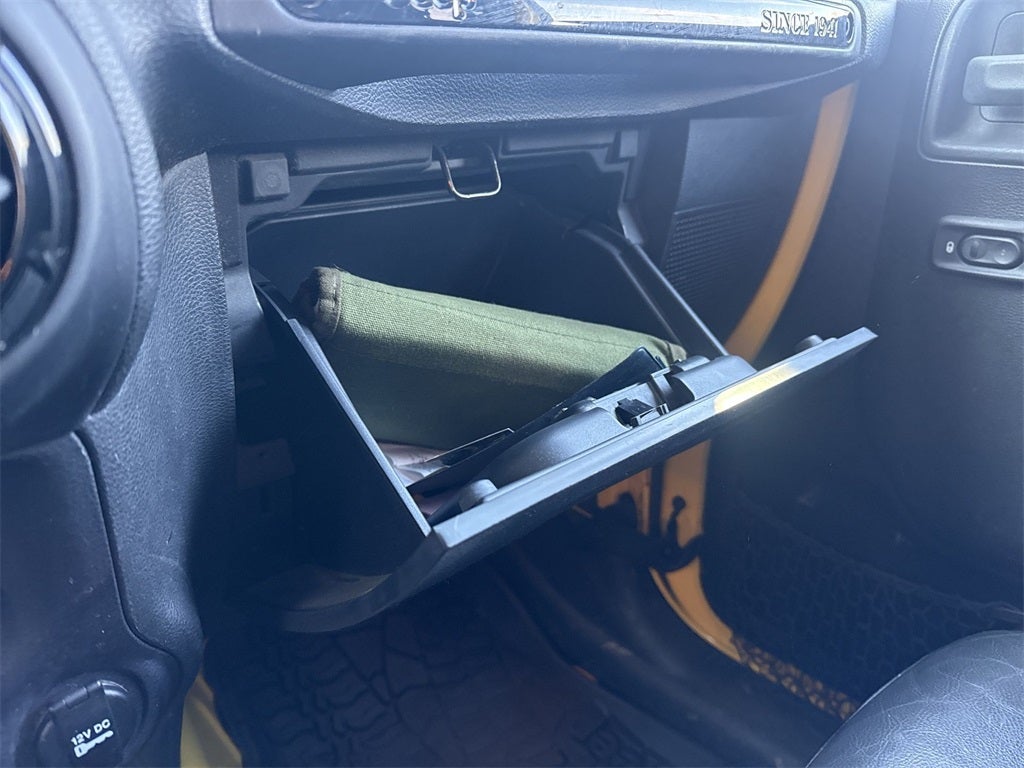 ABS brakes, Alloy wheels, Compass, Electronic Stability Control, Heated door mirrors, Illuminated entry, Low tire pressure warning, Remote keyless entry, Traction control, 18 x 7.5 Polished Satin Carbon Wheels, 3.21 Rear Axle Ratio, 4-Wheel Disc Brakes, 8 Speakers, Air Conditioning, AM/FM radio, Audio Jack Input for Mobile Devices, Auto-dimming Rear-View mirror, Brake assist, CD player, Cloth Bucket Seats, Driver door bin, Driver vanity mirror, Dual front impact airbags, Front anti-roll bar, Front Bucket Seats, Front Center Armrest w/Storage, Front fog lights, Front reading lights, Fully automatic headlights, Heavy Duty Suspension w/Gas Shocks, Integrated roll-over protection, Leather steering wheel, Leather Wrapped Steering Wheel, Occupant sensing airbag, Outside temperature display, Panic alarm, Passenger door bin, Passenger vanity mirror, Power door mirrors, Power steering, Power windows, Radio data system, Radio: Uconnect 130 AM/FM/CD/MP3, Rear anti-roll bar, Security system, Speed control, Split folding rear seat, Steering wheel mounted audio controls, Sunrider Soft Top, Tachometer, Tilt steering wheel, Trip computer, and Variably intermittent wiperS.